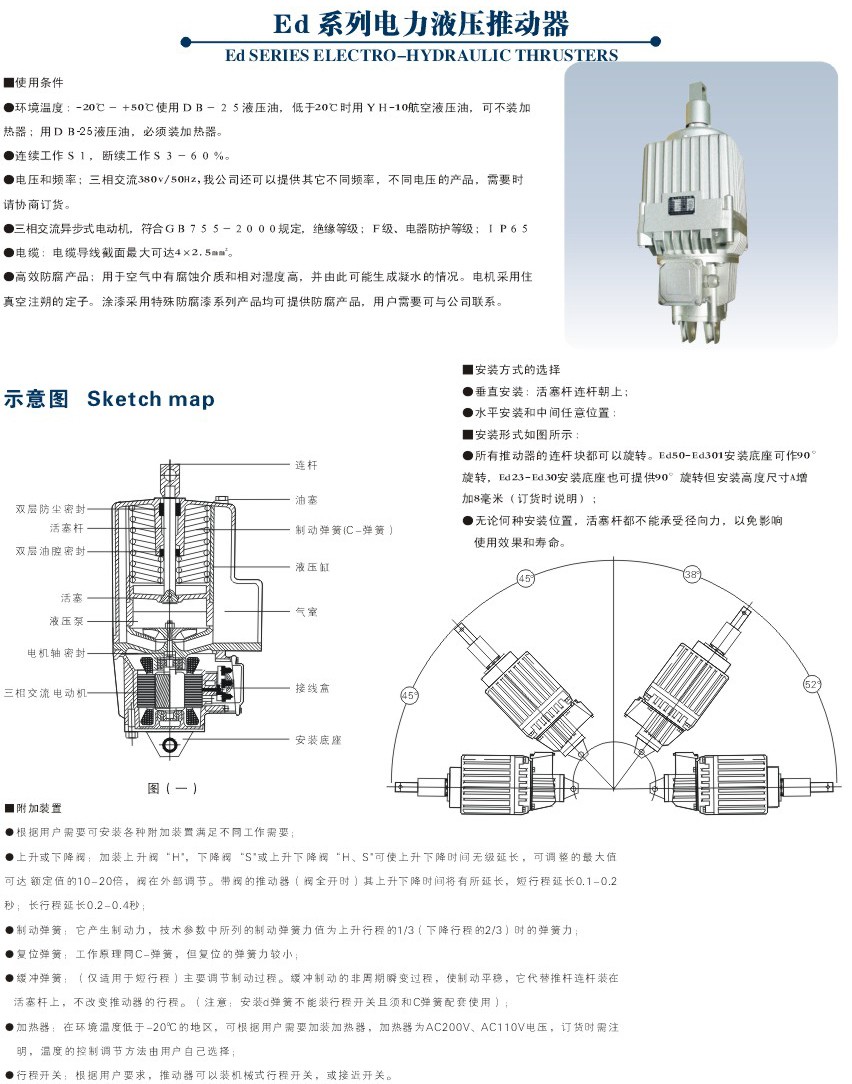 ED電力液壓推動器是一種集電機(jī)、離心泵、油缸為一體,結(jié)構(gòu)緊湊的驅(qū)動操控設(shè)備,廣泛用作各種塊式制動器和盤式制動器的驅(qū)動設(shè)備,還能夠用于各種工業(yè)閥門、閘口、定向搖擺和轉(zhuǎn)動(<90°)設(shè)備及夾緊設(shè)備的驅(qū)動操控功能及結(jié)構(gòu)特色